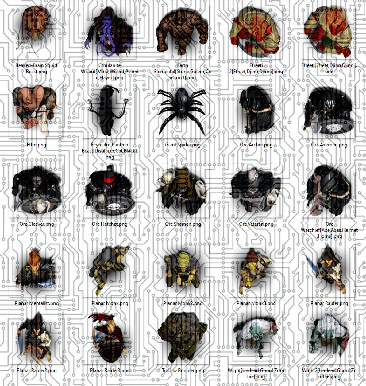 This token pack consist of 25 uniquely designed, 3D rendered vtt tokens, depicting various fantastic denizens (Planar Monks, Planar Raiders, Orcs, an Ettin, Efreeti, Earth Elemental, Cthulanite Wizard, Wights, a Feyrealm Panther-beast, and more). These tokens are suitable for use with any fantasy roleplaying game and are optimized for virtual table top (VTT) play. Darkwoulfe' token packs help you fill your game session with character!
