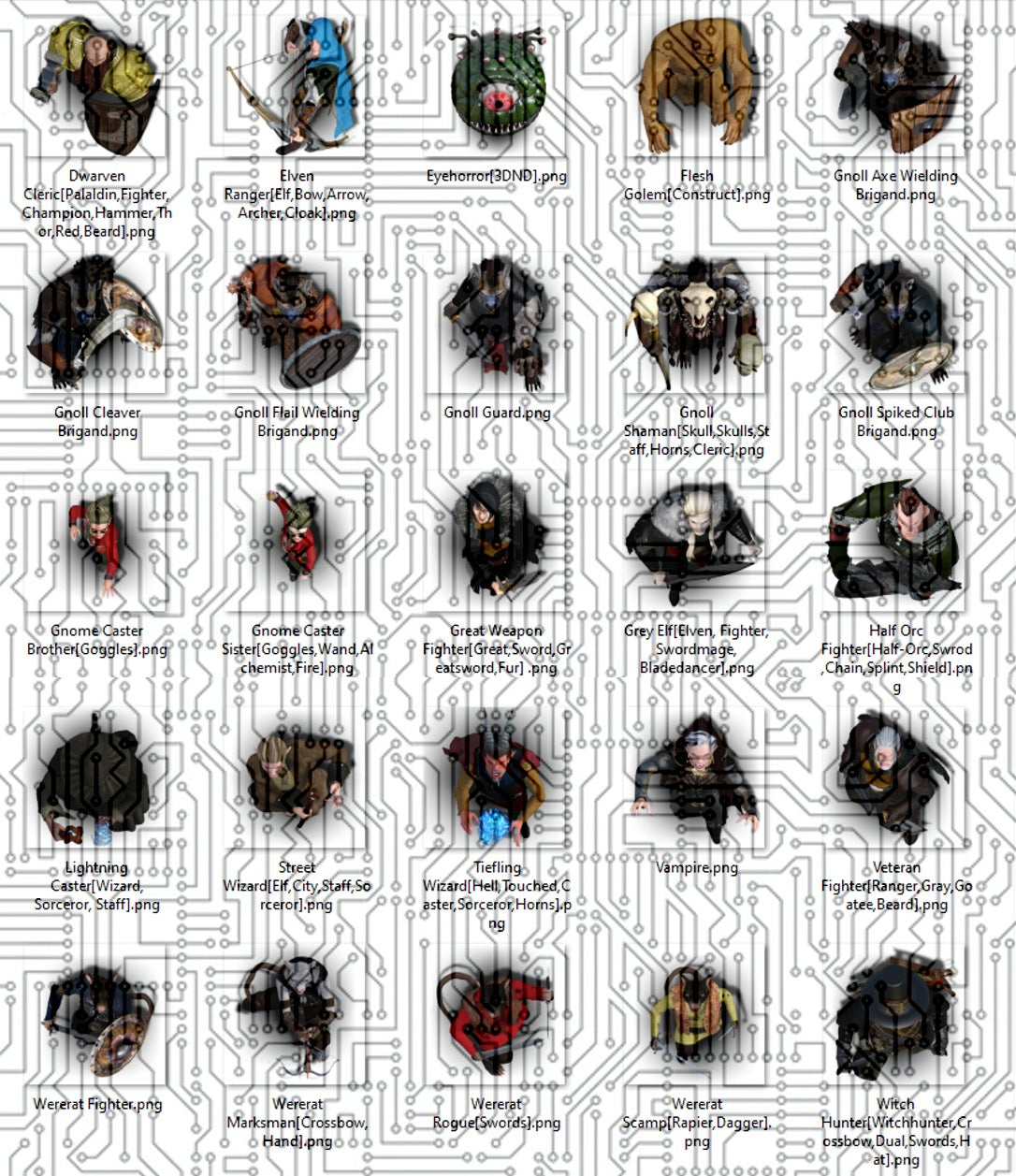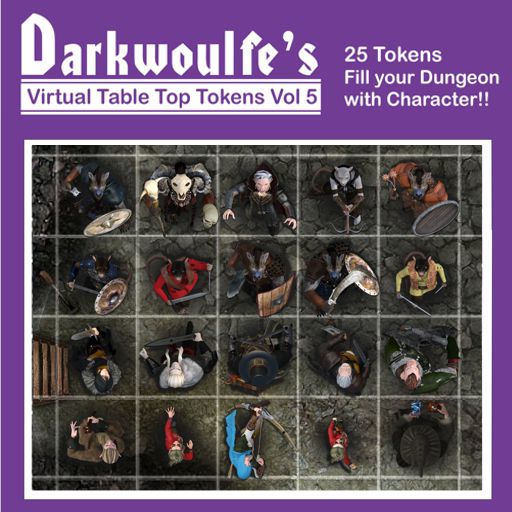 This product consist of 25 uniquely designed, 3D rendered vtt tokens, depicting both heroes (Cleric, Rangers, Fighters, Wizard, Sorcerer, Gnomes, Dwarf,Grey Elf, Tiefling, and Witch Hunter) and villains/monsters (Gnolls, Wererats, a Vampire, Flesh Golem and an Eyehorror). These tokens are suitable for use with any fantasy role-playing game and are optimized for virtual table top (VTT) play.