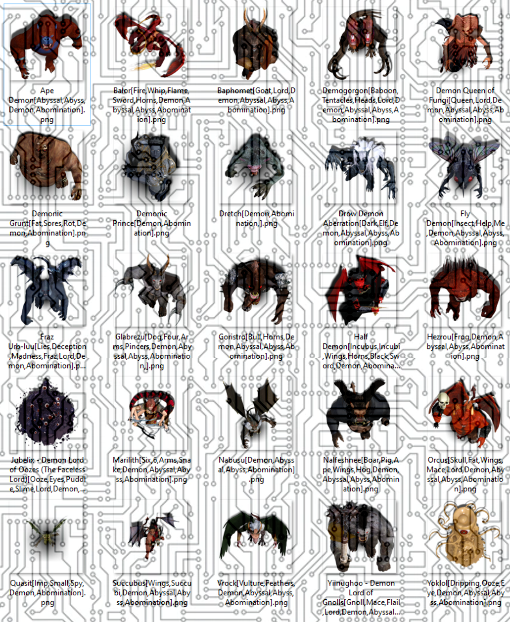 This product consist of 25 uniquely designed, 3D rendered vtt tokens, depicting various fantastic denizens(Balor, Dretch, Vrock, Yoklol, Yiinughoo, Quasit, Nabasu, Jubelix, Glabrezu, Hezrou, Marilith, Succubus, Demogorgon, Baphomet, Orcus, Fraz’Urb-luu). These tokens are suitable for use with any fantasy role-playing game and are optimized for virtual table top (VTT) play.